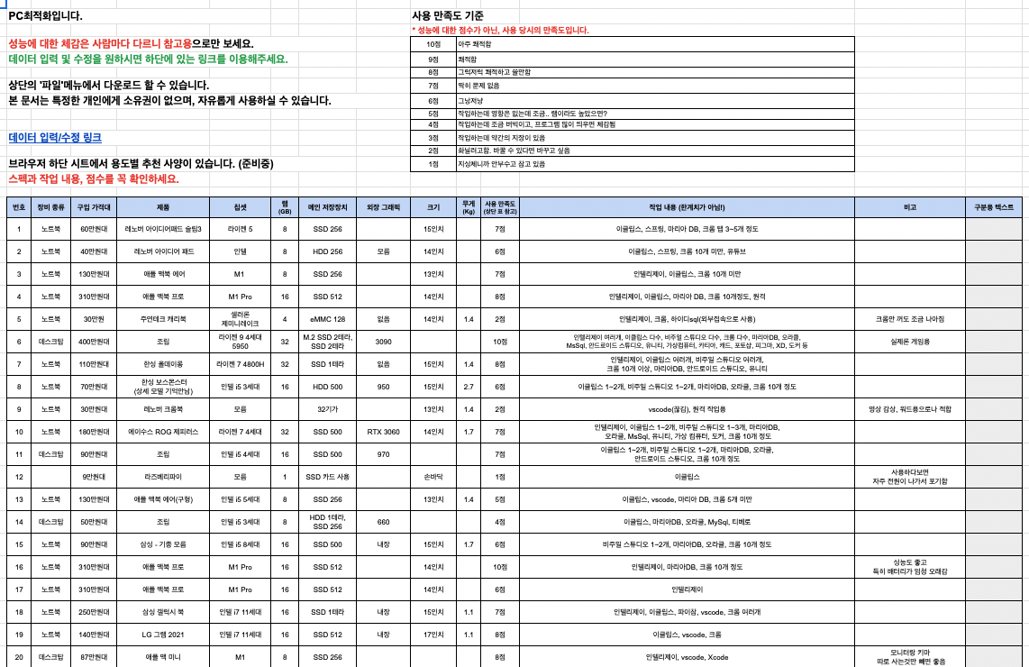노트북, 데탑, 모니터 등 개발자를 위한 장비 추출 시트입니다.