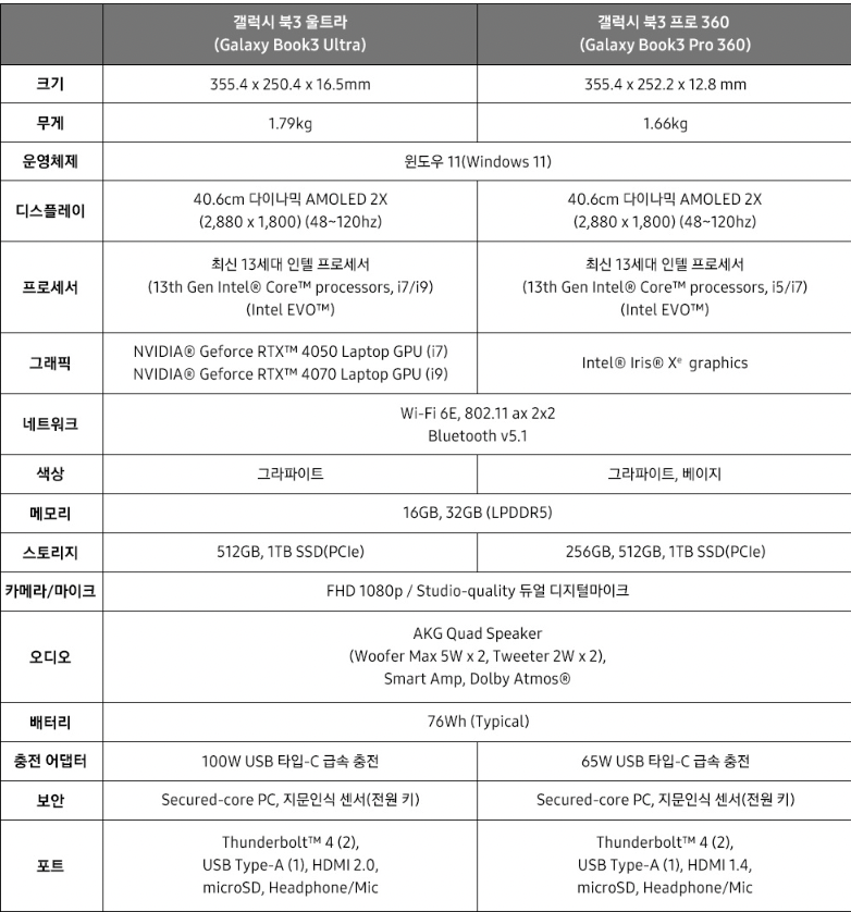 갤럭시북3 울트라, 프로360, 프로14, 프로16에 대한 성능표입니다. 각 제품군별 성능 비교를 하셔서 목적에 맞는 제품인 지를 먼저 따져보시는걸 권장드립니다.(크기, 무게, 디스플레이, 배터리 지속시간 등)