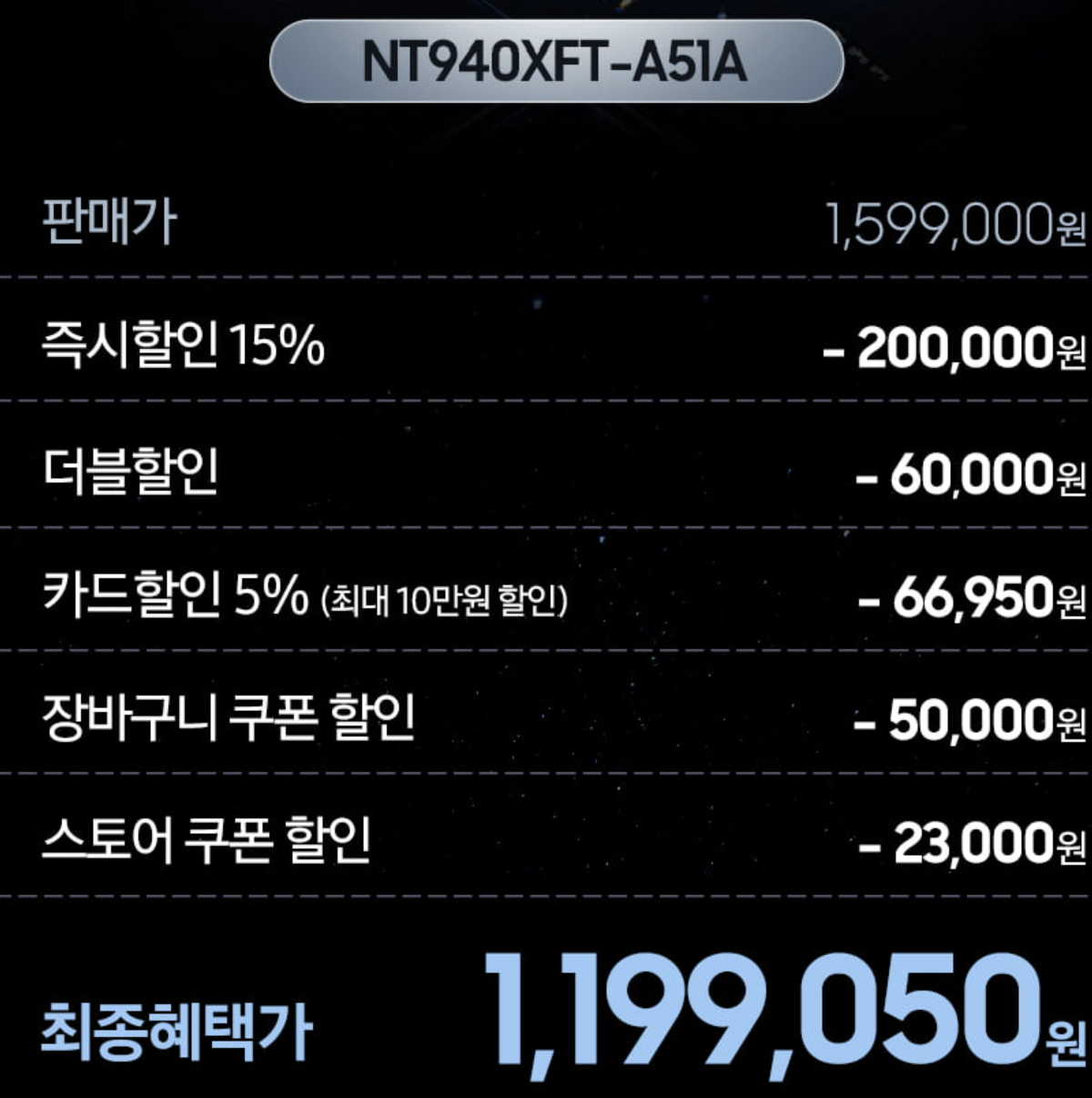 11번가에서 갤럭시북 NT940XFT-A51A 모델에 한해 현재 엄청난 혜택가로 판매되고 있습니다. 해당 판매처는 삼성전자의 공식파트너로 정품을 믿고 판매하는 곳 입니다. 링크는 11번가에 들어가셔서 NT940XFT-A51A 키워드로 검색하시면 됩니다.