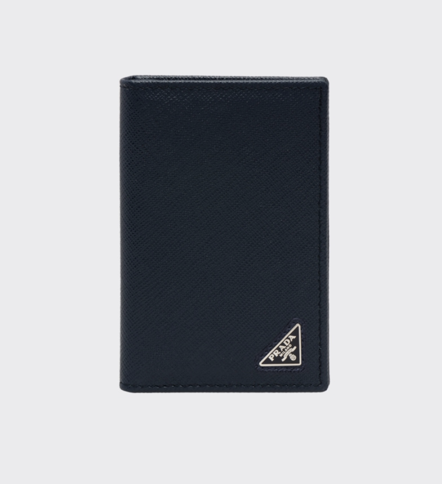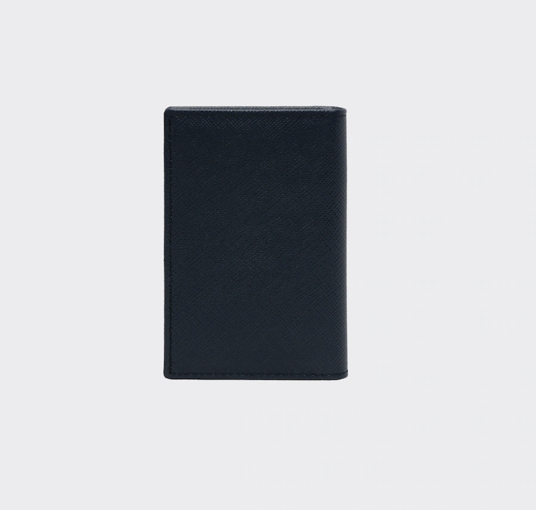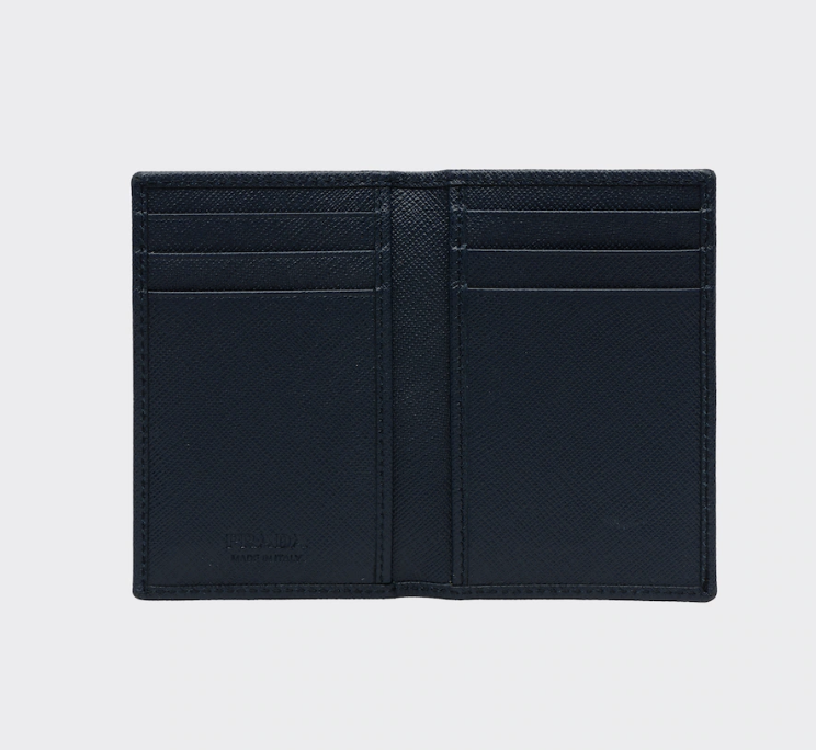 프라다 지갑입니다. 프라다 지갑을 논하려면 장지갑을 빼놓을 수 없는데요. 아래 제품은 코너에 삼각형 프라다 로고가 있는 모노톤의 사피아노 가죽 신용카드 지갑입니다. 내부에 신용카드 슬롯 6개, 포켓 2개, 히트 엠보싱 처리된 프라다 로고가 있습니다.