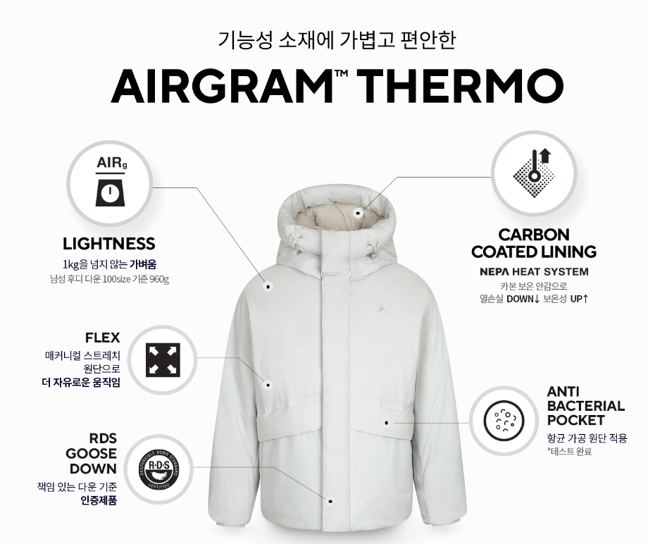 네파에서 올해 2022년 라인업으로 새롭게 선보인 패딩 라인입니다. 기능성 소재를 갖춘 편안한 의류를 만들자는 모티브로 AIRGRAM THERMO라는 타이틀을 내걸었는데요. 그램이라는 것을 떠올리면 노트북을 생각할 수 있는데, 패딩에서도 이번에 1KG을 넘지 않는 가벼움을 상징하는 단어로 채택되어 사용되었습니다. 정말로 다운자켓이지만 기술력이 실현되어 1kg을 넘지 않아 신기함을 감출 수 없습니다. 또한 각종 좋은 재질의 구스다운 그리고 향균 가공 원단이 적용되어 우수한 제품의 상징을 나타내는 것을 알 수 있습니다.
