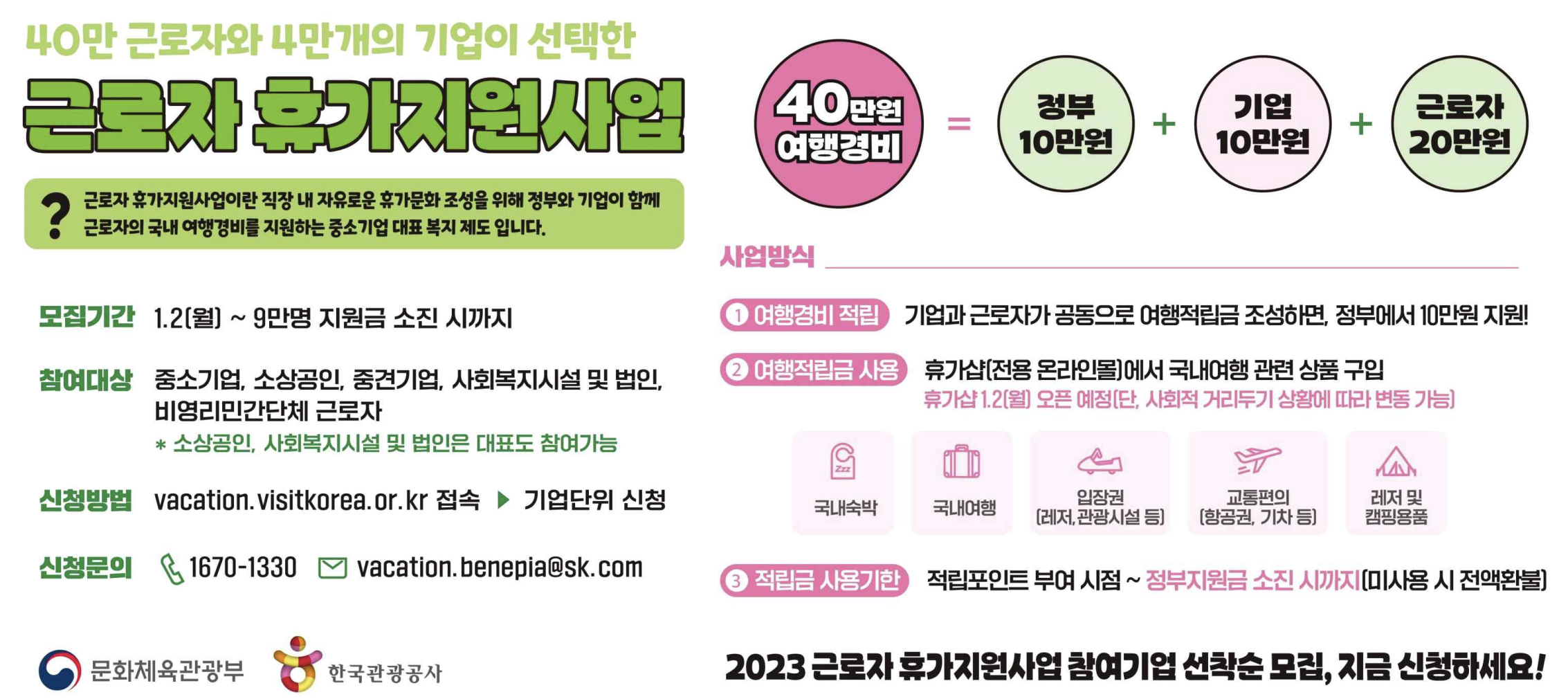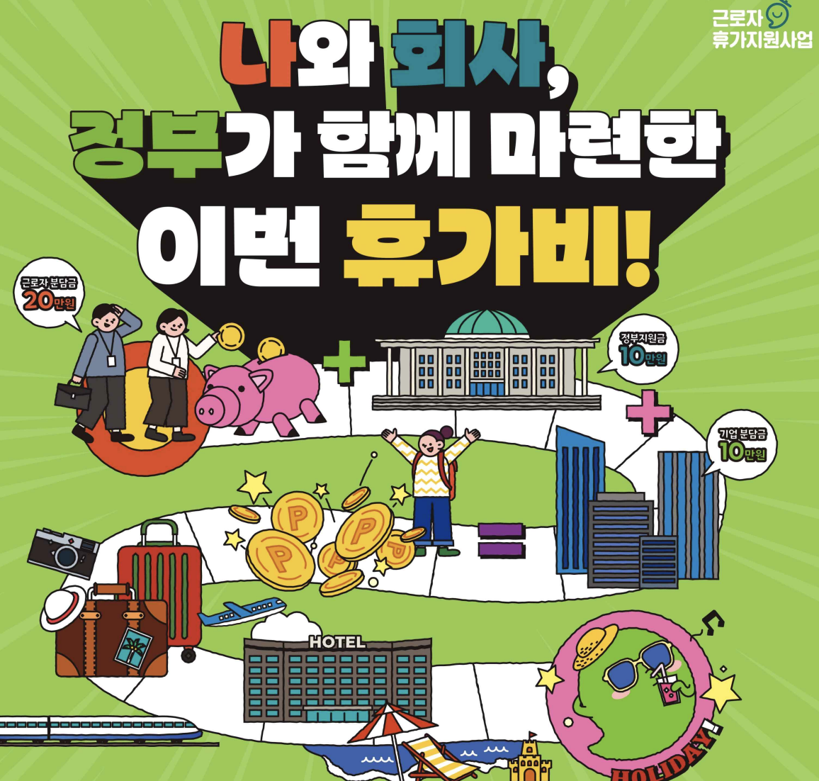근로자 휴가 지원 사업을 통해 근로자들의 휴가를 자유롭게 사용할 수 있도록 도모하며, 국내 여행 활성화 취지로 이번 사업을 진행했습니다. 근로자가 20만 원을 적립하면, 근로자가 몸담고 있는 회사와 정부가 각각 10만 원을 추가 적립하여 총 40만 원을 지원하는 프로그램입니다.