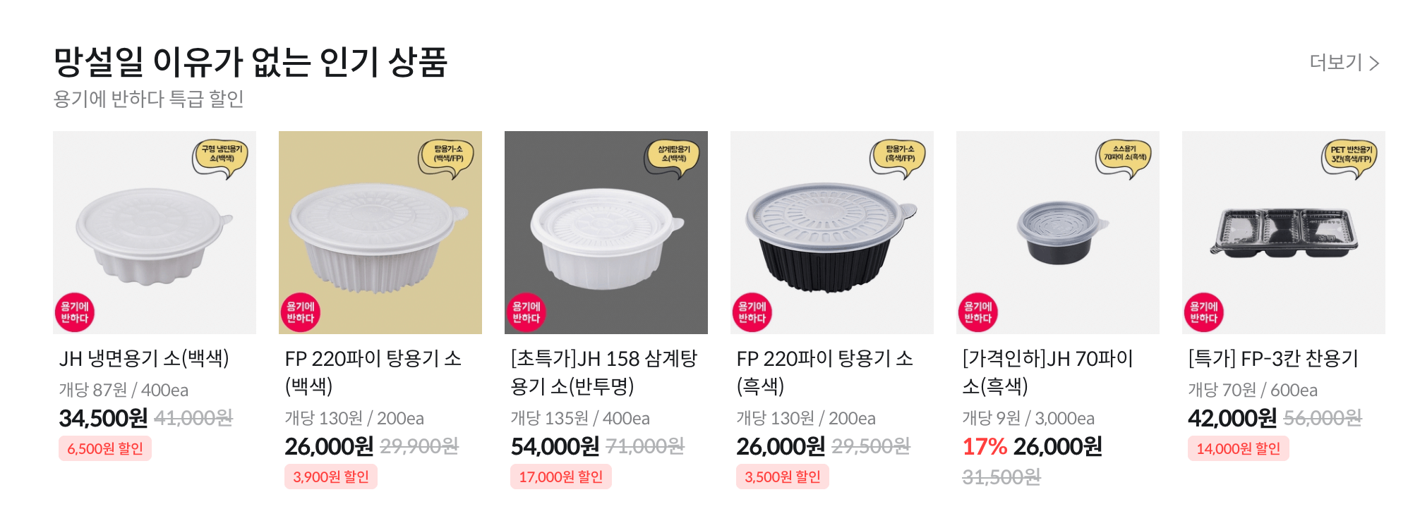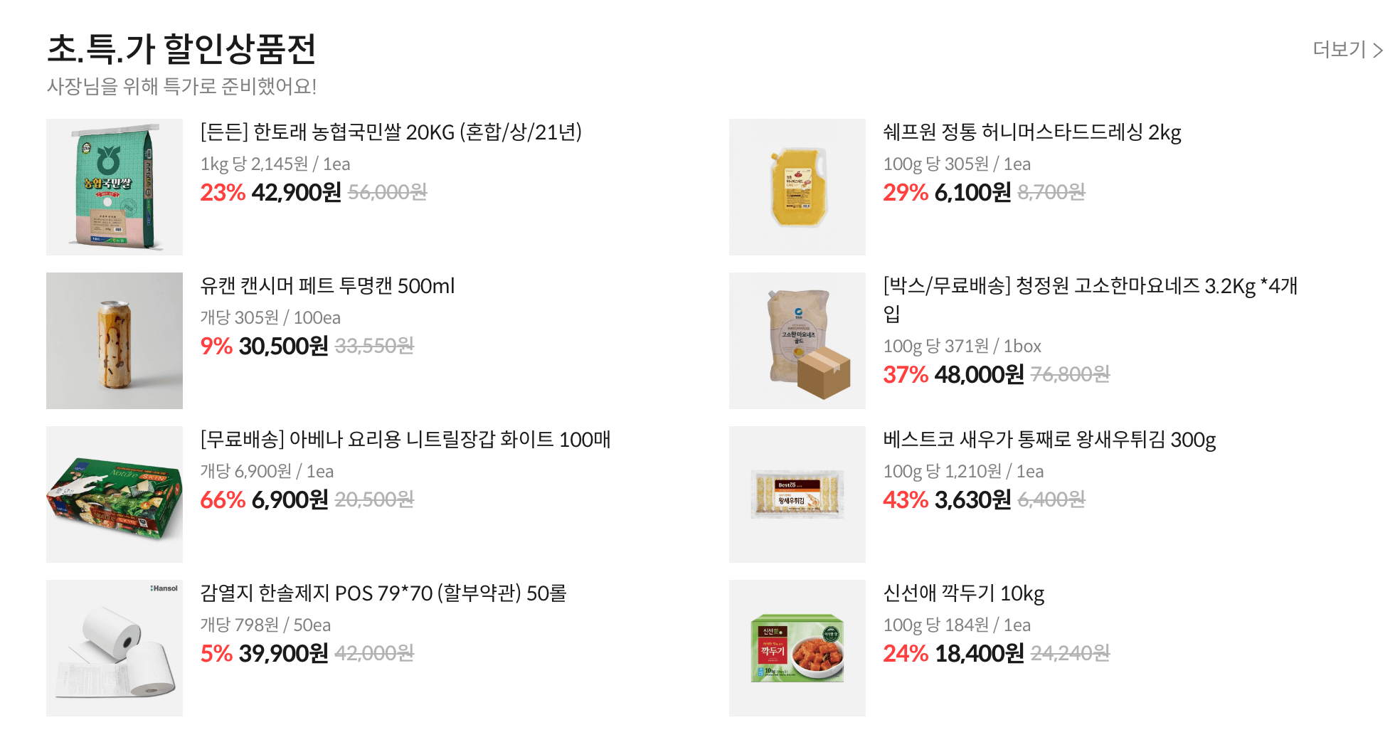 해당 플랫폼에서는 가공식품에 해당하는 냉동부터 냉장 그리고 반찬류와 배달용품, 주방용품등 정말 장사를 하시는 분들에게는 꼭 필요한 A부터 Z까지 모든 제품을 총망라하여 팔고 있습니다. 특히 가격이 저렴한 것이 특징이며 친환경을 생각한 지구를 위한 제품들도 있어서 소비자들의 큰 호응이 예상되고 있습니다. 또한 다른 사장님들이 구매한 제품들도 따로 마련하여, 경쟁사가 주로 어떤 제품을 사용하는지 그리고 우리가 사용하는 제품이 랭킹 몇 순위인지도 알 수 있기에 한 층 둘러보는 재미가 있습니다.