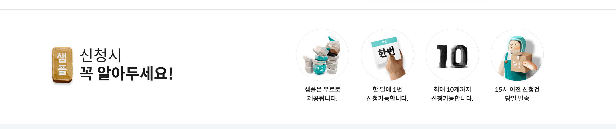 처음부터 다량으로 구매하기에는 다소 부담스러운 개수가 될 수 있으니 이를 해결하기 위해 배민에서는 샘플을 제공하는 이벤트도 진행합니다. 샘플 이벤트는 상시 진행되며, 무료입니다. 그리고 여러 번 남용 방지를 위해 한 달에 1번 최대 10개 신청이 가능하며, 배송은 15시 이전 신청건에 한 해 당일 발송을 원칙으로 두고 있습니다.