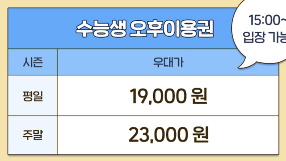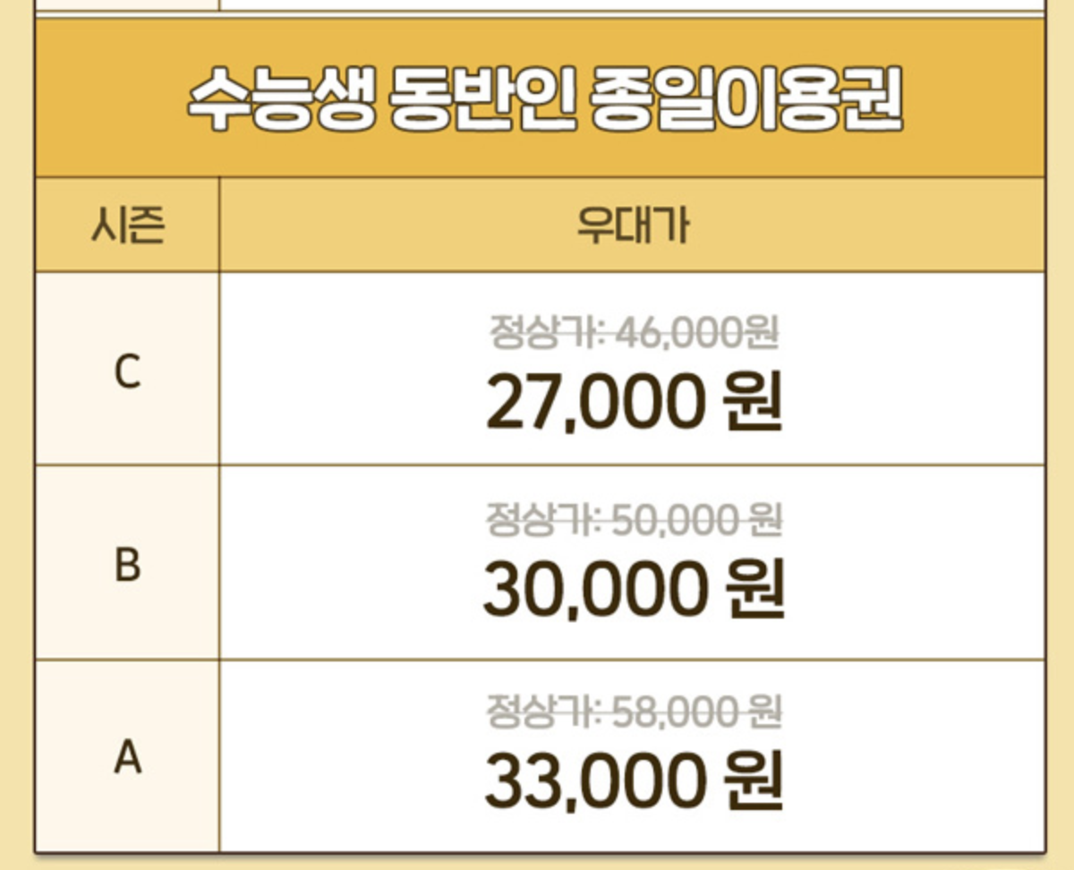 매해 고생한 수험생들을 위해 다양한 이벤트 행사를 파격으로 진행하는 에버랜드. 올해도 어김없이 수능생 전용 오후 이용권 및 종일 이용권을 할인폭이 큰 금액대로 제공을 하는데요. 수험생 뿐 아니라, 동반인도 할인이 가능하오니 지인이 있으시다면 참고하시길 바랍니다.