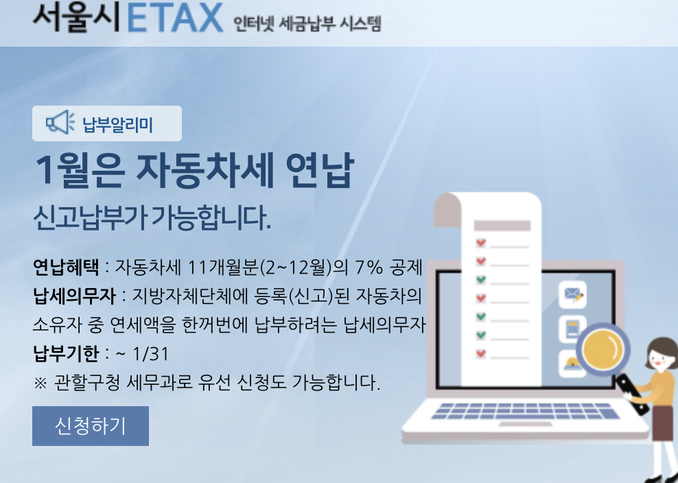 자동차를 소유하고 있다면 매년 내야 하는 세금이 있지요. 바로 자동차세입니다. 자동차를 소유하고 있으면 내야하는 세금의 한 종류로 매년 초에 해당 년도의 연납을 실시하게됩니다.승용차 기준으로 배기량 cc당 세액을 곱하여 계산하는데 차량 연식 및 용도에 따라 감면 혜택도 주어집니다. 여기서 중요한 건 연납 신청 시 최대 10% 할인받을 수 있다는 점인데요.
