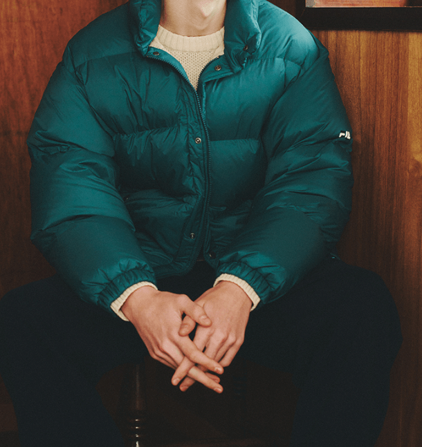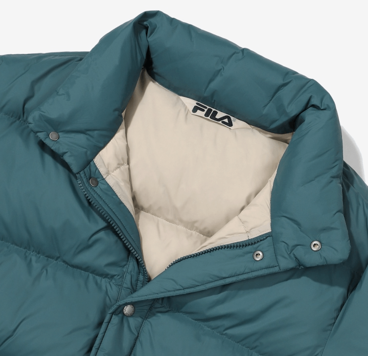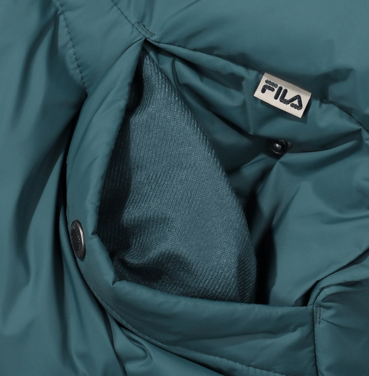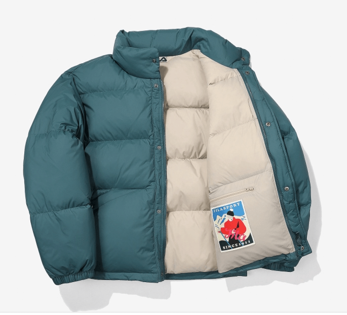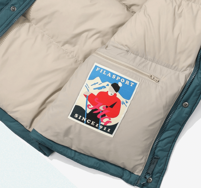 배색 안감을 통해 제작되었으며, 휠라의 스키 영감을 통해 자체 개발한 라벨은 내부의 독특한 포인트 역할을 제대로 하는 부분이라 생각합니다. 또한 소매와 하단부에 충전재가 빠져나가지 않도록 다운프루프 처리가 되어 보온성이 뛰어나다고 알려져 있습니다.