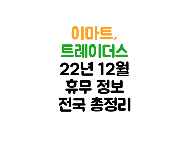 2022년 12월 이마트 매장과 이마트 트레이더스 매장에 대한 휴무일에 대한 정보를 총정리했습니다. 이번 시간에는 전화번호까지 기재했으니 매장에 문의가 있는 경우 해당 번호로 유선 문의드리면 원하시는 답변을 얻으실 수 있습니다. 참고 바랍니다.
