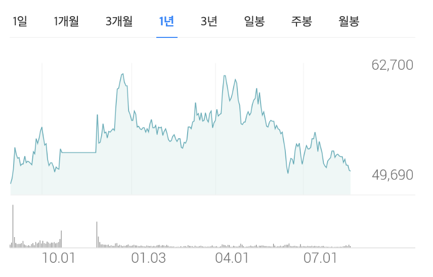최근 1년 기준 현재 주가는 51,200원(2022년도 8월 18일 기준)이며, 52주 고가는 63,100원, 52주 저가는 48,742를 기록했습니다. PBR(Price to Book Ratio : 주가순자산비율)은 주가를 주당순자산으로 나눈 값은 0.97배로 순자산가치대비 낮은 수준을 보여주고 있으므로, 앞으로의 횡보가 기대되는 차트라고 생각합니다.